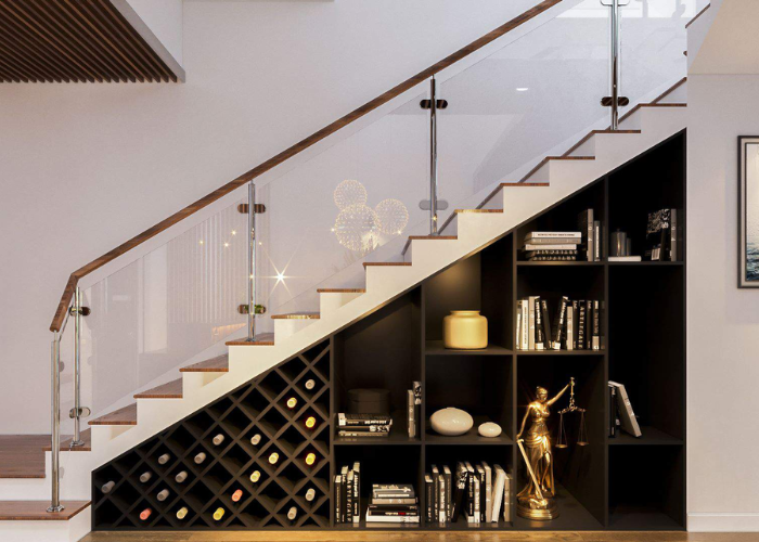 Tối ưu diện tích "chết": Biến khoảng trống dưới cầu thang thành khu vực lưu trữ hữu ích.