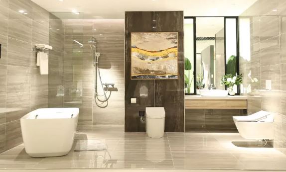 ✅ Thiết bị vệ sinh thông minh: Bồn cầu cảm ứng, vòi sen đa chế độ, gương đèn LED, tủ lavabo tích hợp ngăn chứa tiện dụng.