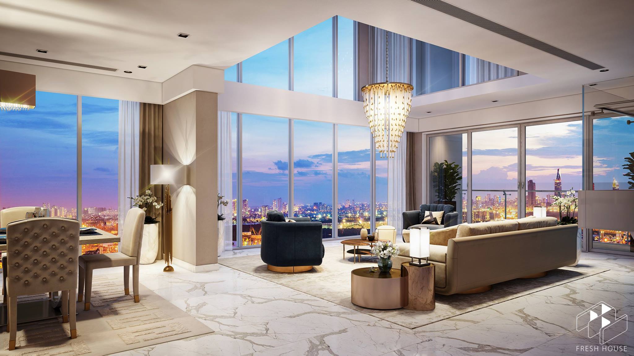 Nội thất cao cấp – kiểu dáng tối giản: Sofa bọc vải/da cao cấp, bàn trà mặt đá, kệ tivi gọn gàng… đều chú trọng vào công năng và thẩm mỹ.