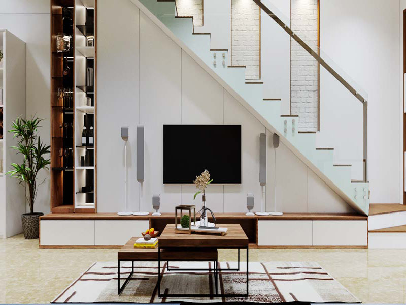 Tối ưu diện tích "chết": Biến khoảng trống dưới cầu thang thành khu vực lưu trữ hữu ích.